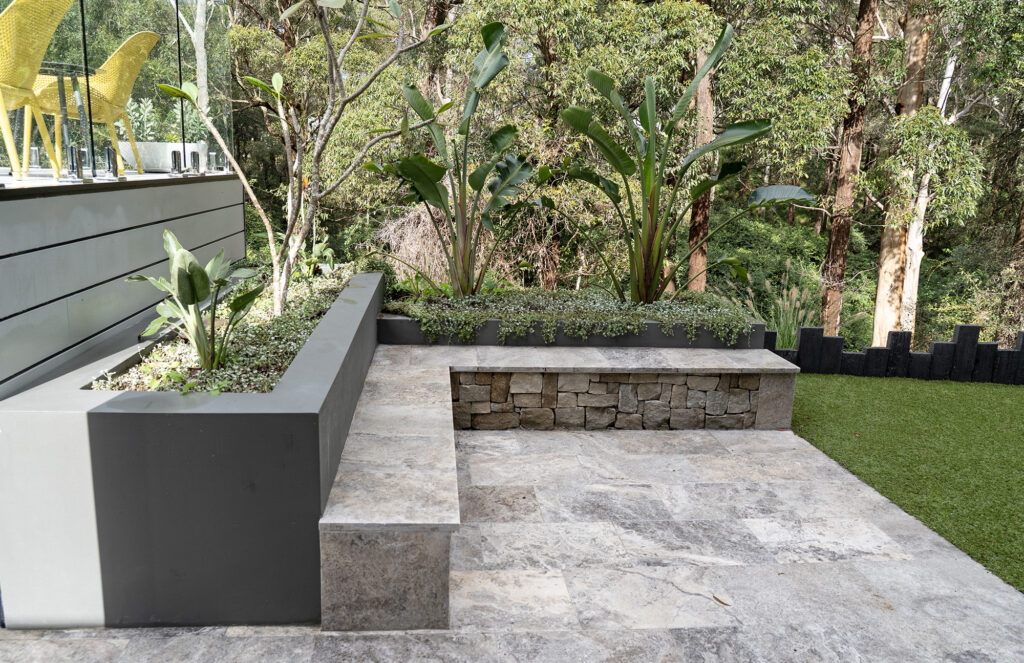 This project presented our team with several challenges. Accessing our client’s backyard proved extremely difficult, requiring permission from a neighbouring property to bring machinery and materials. The steeply sloping yard also posed a challenge. Still, by adhering to the design provided by MUD Landscape Design, JRL executed the project to impeccable standards. Furthermore, the client’s residence fell within a ‘flame zone’ BAL rating area, necessitating the use of entirely non-combustible materials—no timber was allowed in construction.