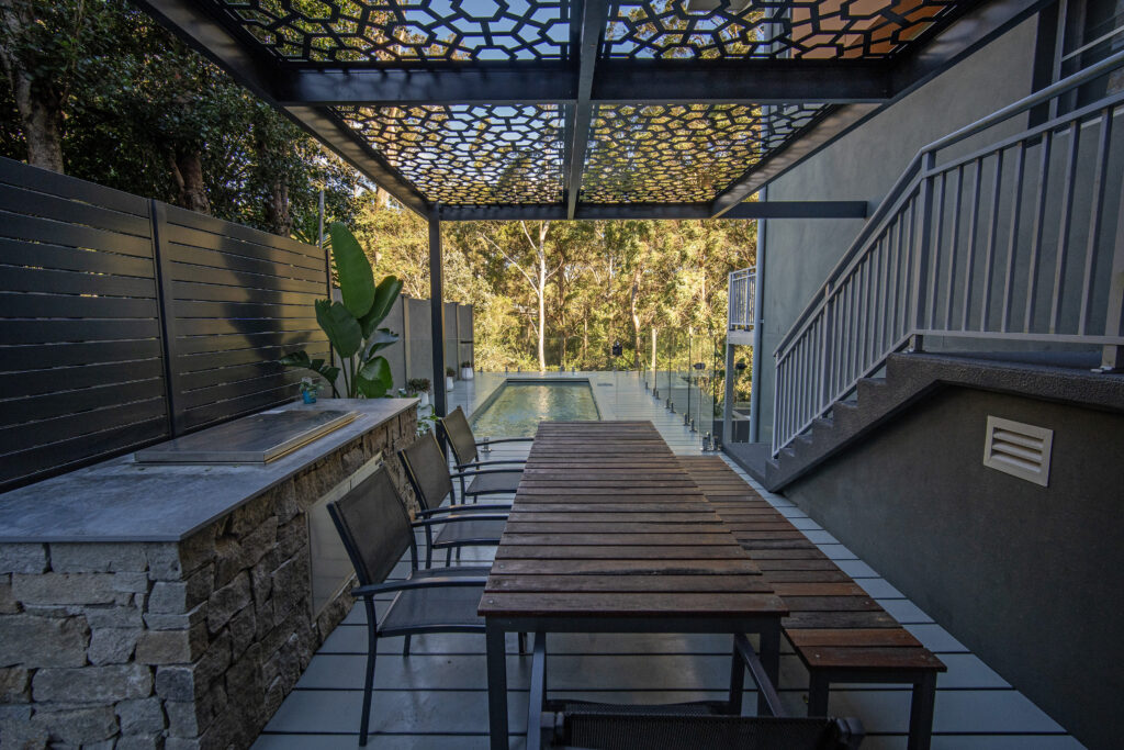 The client was after a functional and easily maintainable outdoor space for her children; in collaboration with MUD Landscape Design, the team came up with a landscape design that incorporated various elements, such as a pool, an entertainment area, decking, outdoor seating and lighting, and a dedicated cubby house for the kids.